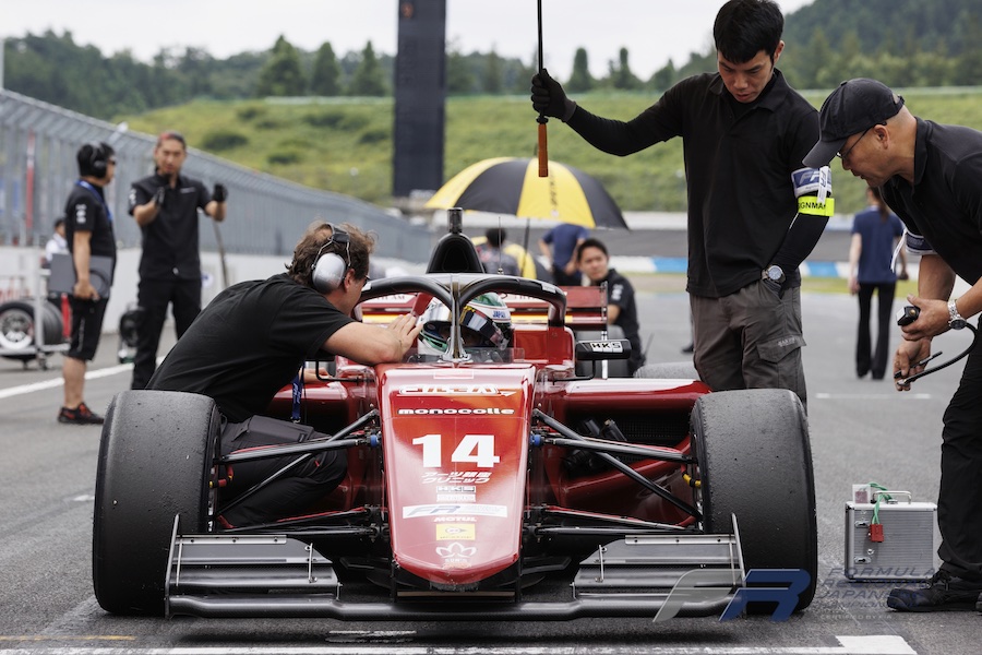 フォーメーションラップでコースを1周しながら、タイヤに熱を入れながら路面状況を確認し各車が再びグリッドに整列すると、シグナルレッドがブラックアウトしてレースはスタート。ポールポジションの小川選手は今回も好スタートを決めてトップで1コーナーを駆け抜け、14号車のエンツォ・トゥルーリ選手(TOM’S FORMULA)、97号車の奥住慈英選手(Bionic Jack Racing F111/3)が続きます。小川選手はペースを上げて2番手以下との差を広げていき、2周目で小川選手とトゥルーリ選手の差は1.347秒差となります。しかし、トゥルーリ選手も引き離されまいとペースを上げて、3周目には小川選手を上回るラップタイムを刻んで追い上げを開始します。ここからトゥルーリ選手のペースは一挙にアップし、9周目にはレースファステストとなる1分51秒649を記録して、小川選手との差は0.619秒まで縮まりました。一方、3番手スタートの奥住選手はトップ2台との差が2秒以上に広がってしまい、4番手は27号車のリアム・シーツ選手(Sutekina Racing)、5番手は3号車のミハエル・サウター選手(Sutekina Racing)という順位で周回を重ねます。