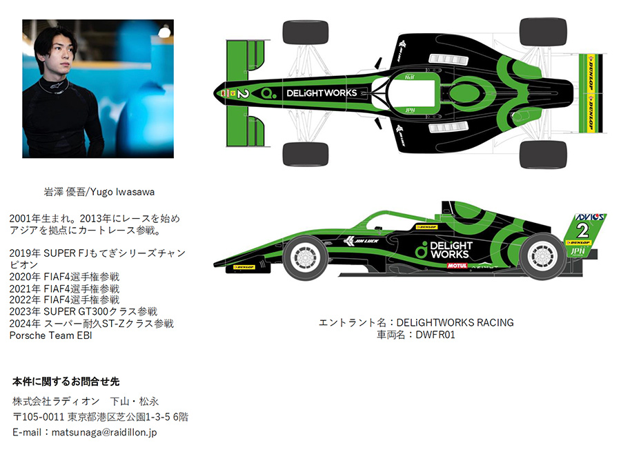ディライトワークス株式会社、代表取締役庄司 顕仁は、<DELiGHTWORKS RACING>を立ち上げ、レーシングドライバー・エンジニア・メカニックの育成を目的に2024 FORMULA REGIONAL JAPANESE CHAMPIONSHIP Round6(Race13-14)にスポット参戦します。